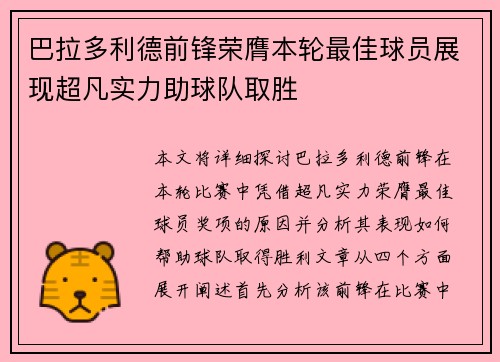 本文将详细探讨巴拉多利德前锋在本轮比赛中凭借超凡实力荣膺最佳球员奖项的原因,并分析其表现如何帮助球队取得胜利。文章从四个方面展开阐述:首先,分析该前锋在比赛中的技术发挥,包括控球、传球和射门等方面;其...