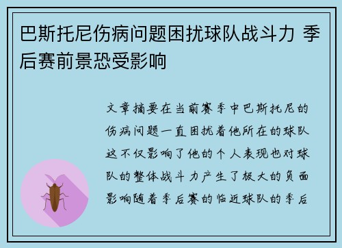 巴斯托尼伤病问题困扰球队战斗力 季后赛前景恐受影响