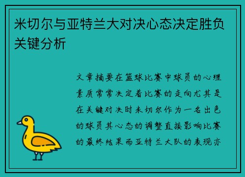 文章摘要:在篮球比赛中,球员的心理素质常常决定着比赛的走向,尤其是在关键对决时。米切尔作为一名出色的球员,其心态的调整直接影响比赛的最终结果,而亚特兰大队的表现亦受到球员心理状态的深刻影响。本文将从四个方面对米切尔与亚特兰大对决时心态的决定...