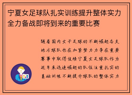 宁夏女足球队扎实训练提升整体实力全力备战即将到来的重要比赛