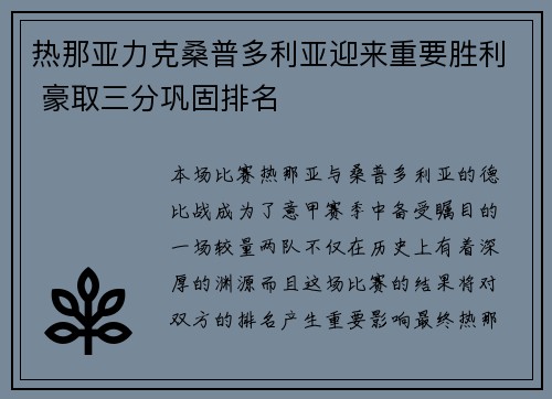本场比赛,热那亚与桑普多利亚的德比战成为了意甲赛季中备受瞩目的一场较量。两队不仅在历史上有着深厚的渊源,而且这场比赛的结果将对双方的排名产生重要影响。最终,热那亚在主场以一场令人信服的胜利击败了桑普多利亚,拿下了宝贵的三分。这场胜利不仅巩固...