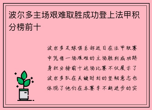 波尔多足球俱乐部近日在法甲联赛中凭借一场艰难的主场胜利,成功跻身积分榜前十。这场比赛不仅展示了波尔多队在关键时刻的坚韧意志,也体现了他们在本赛季不断进步的实力。本文将从多个角度对波尔多主场艰难取胜的比赛进行详细分析,并探讨这一胜利对于球队未...