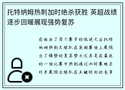 托特纳姆热刺加时绝杀获胜 英超战绩逐步回暖展现强势复苏