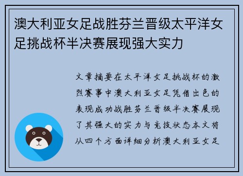 澳大利亚女足战胜芬兰晋级太平洋女足挑战杯半决赛展现强大实力