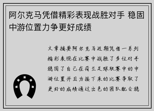 阿尔克马凭借精彩表现战胜对手 稳固中游位置力争更好成绩