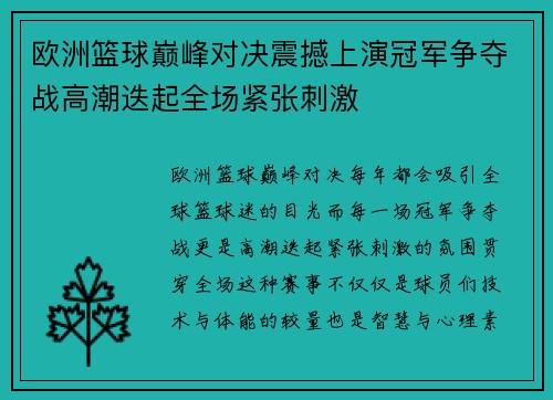 欧洲篮球巅峰对决震撼上演冠军争夺战高潮迭起全场紧张刺激
