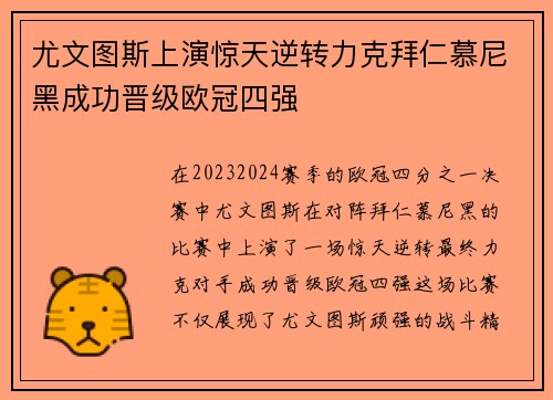 在2023-2024赛季的欧冠四分之一决赛中,尤文图斯在对阵拜仁慕尼黑的比赛中上演了一场惊天逆转,最终力克对手成功晋级欧冠四强。这场比赛不仅展现了尤文图斯顽强的战斗精神,更体现了球队的战术素养和关键球员的出色发挥。从比赛的初期不利局面,到最...