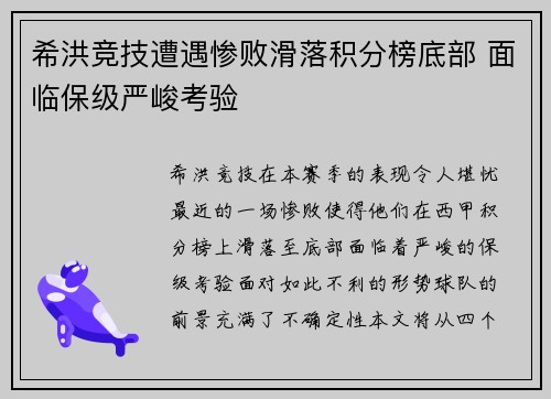 希洪竞技遭遇惨败滑落积分榜底部 面临保级严峻考验
