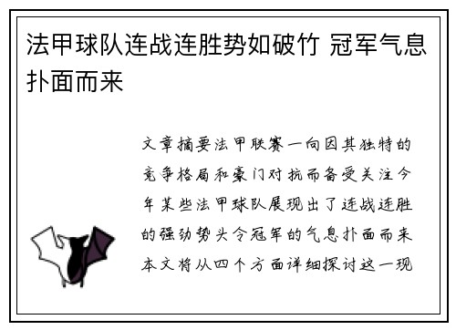 法甲球队连战连胜势如破竹 冠军气息扑面而来
