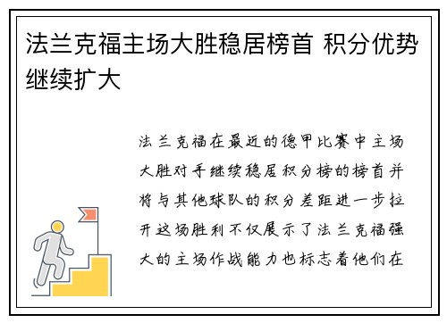 法兰克福主场大胜稳居榜首 积分优势继续扩大