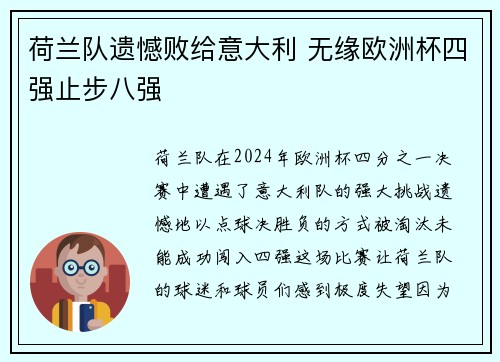 荷兰队遗憾败给意大利 无缘欧洲杯四强止步八强